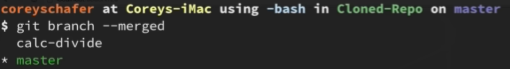 The output of the original command that we used to check what had or hadn't been merged now shows us the calc-divide branch is present: